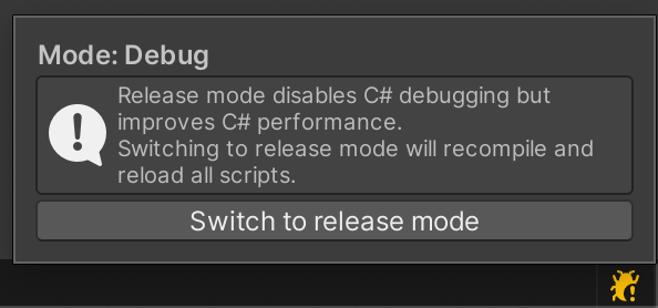 Unity 에디터 상태 표시줄의 우측 하단에서 Code Optimization 모드를Debug로 설정합니다.Edit > Preferences > General > Code Optimization On Startup을 사용하여 시작할 때 이 모드를 변경할 수도 있습니다.