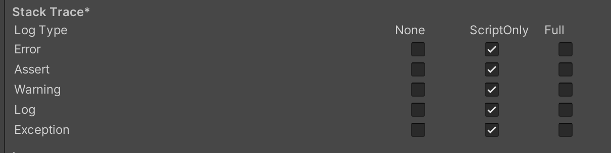 Application.SetStackTraceLogType을 사용하거나 플레이어 설정에서 해당 옵션을 체크하여 스택 추적을 포함할 로그 메시지 유형을 결정하세요. 스택 추적은 유용하게 사용할 수 있지만, 속도가 느리고 가비지를 생성합니다.