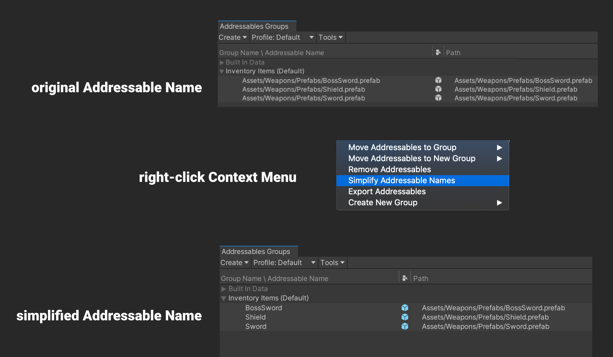 어드레서블 에셋 시스템으로 메모리 최적화하기포스팅에서 메모리 효율성을 높이는 방식으로 Addressables Groups를 구성하는 방법에 대한 예시를 볼 수 있습니다. 또한어드레서블 개념 소개튜토리얼에서는 어드레서블 에셋 시스템이 프로젝트에서 어떻게 작동하는지 간단히 설명합니다.
